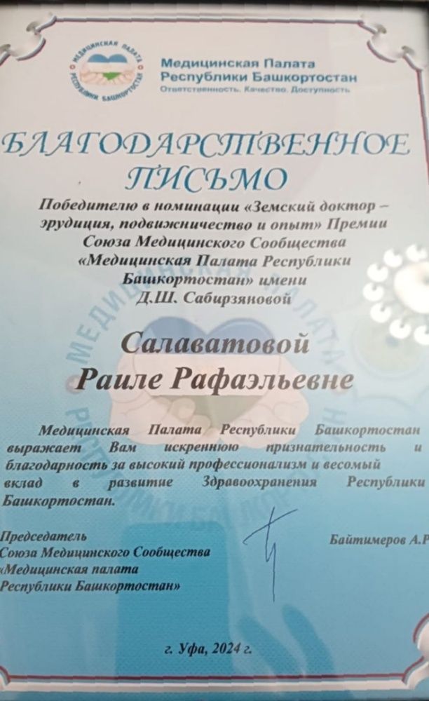 18.12.2024 в г.Уфа состоялся гала концерт с церемонией награждения премией медицинской палаты Республики Башкортостан им .Д.Ш.Сабирзяновой. Победителем в номинации "Земский доктор-эрудиция, подвижничество и опыт" была отмечена благодарственным письмом врач невролог Давлекановской ЦРБ Салаватова Раиля Рафаэльевна.